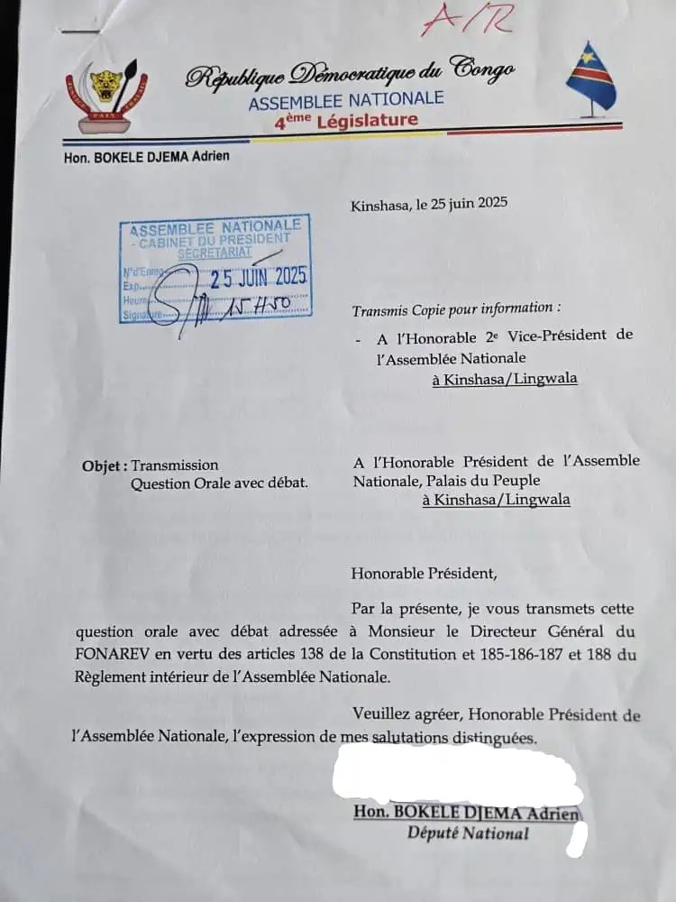 Dans un document daté du 25 juin 2025, adressé au Président de l’Assemblée nationale, le député Bokele a motivé sa démarche en s’appuyant sur les textes légaux régissant le travail parlementaire. « Par la présente, je vous transmets cette question orale avec débat adressée à Monsieur le Directeur Général du FONAREV, en vertu des articles 138 de la Constitution et 185, 186, 187 et 188 du Règlement intérieur de l’Assemblée Nationale », peut-on lire dans sa correspondance.