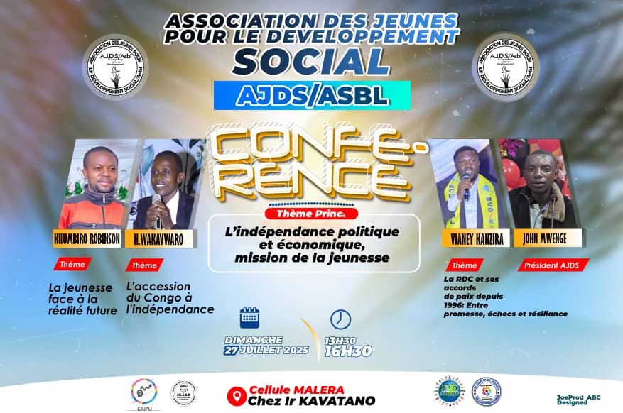 Il s’agit de Kilumbiro Robinson avec le thème  » la jeunesse face à la réalité du futur « , H.Wakavwaro qui décortiquera ce thème :  » L’accession du Congo à l’indépendance  » et enfin Maître Vianney KANZIRA qui analysera ce thème :  » La RDC et ses es accords depuis 1996: Entre promesse, échecs et résilience « .Selon Jhon Mwenge, Président de l’AJDS, toutes les activités relatives à cette méga conférence se dérouleront chez Papa Ir KAVATAKO à Malera de 13h30 à 16h30. Ainsi donc, il invite tous les intéressés surtout les jeunes à venir prendre part à cet événement de grande envergure dont la finalité est l’éveil patriotique.