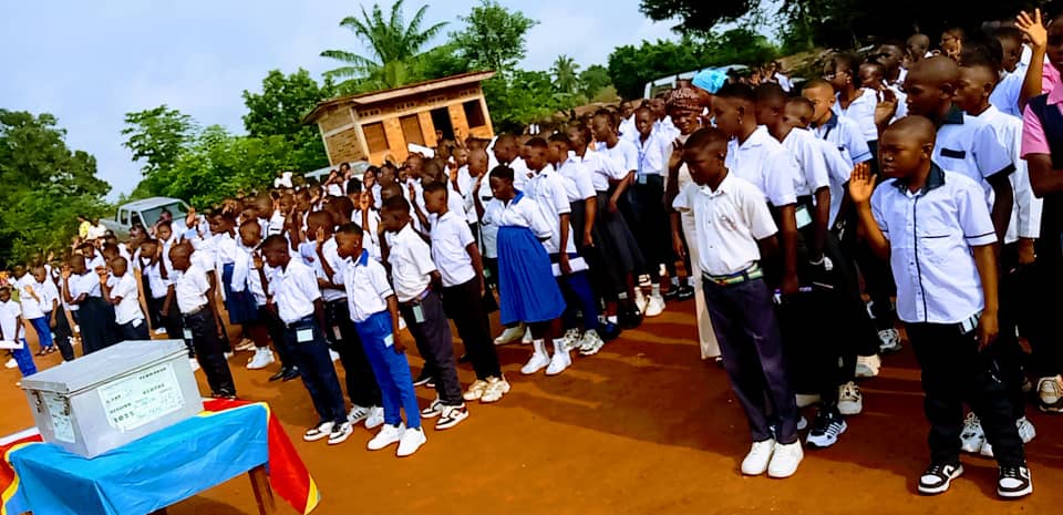 Le tout a commencé par l’hymne national comme exige la coutume congolaise, en suite les élèves en conditions physiques normales ensemble avec leurs collègues sourds muets encadrés par l’ONG Bassin d’Assistance aux Vulnérables pour le Développement Communautaire (BAVDC) ont chanté le serment citoyen de la RDC en soulevant les mains droites.