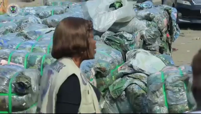 « Ok nous sommes ici sur la neuvième Rue industrielle, aujourd’hui c’était un problème ici où le commissaire Provinciale avait envoyé des éléments de force de l’ordre pour déguerpir les gens ici. Mais sur le champ, les services de sécurité sont venus trouvés des effets militaires. C’est un nombre très important donc 209 sacs des ballons de ces treillis militaires. C’est ainsi que les services de sécurité approfondissent leurs investigations pour que lumière soit faite si cela étaient arrivés ici comment et ça se dirigeaient vers quelle destination. C’est le responsable du dépôt qui nous dira s’il avait commandé ça pour quel but et puis nous donner aussi sa destination. Je remercie nos services de sécurité pour ce travail de titan et puis voyez comment Dieu seul conduit ce pays, des choses faites secrètement et nuitamment mais il les révèlent au grand jour. C’était un problème de déguerpissement mais Dieu a fait à ce qu’ils puissent découvrir ça. » indique une dame.