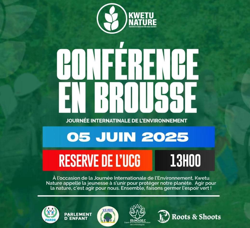 En prélude de la célébration de la journée internationale de l’enfant africain en date du 16 juin, le Parlement d’enfants Butembo-Lubero va participer à une très grande conférence dénommée “ CONFÉRENCE EN BROUSSE ” ce jeudi 05 juin 2025. Ce, à l’occasion de la journée internationale de l’environnement dans la réserve de l’UCG à partir de 13h00. Le Parlement d’enfants Butembo-Lubero sera donc aux côtés de KWETU NATURE, ESNOGEC, ROOTS & SHOOTS, V-E RDC pour réfléchir sur la protection de notre planète en soignant notre environnement.