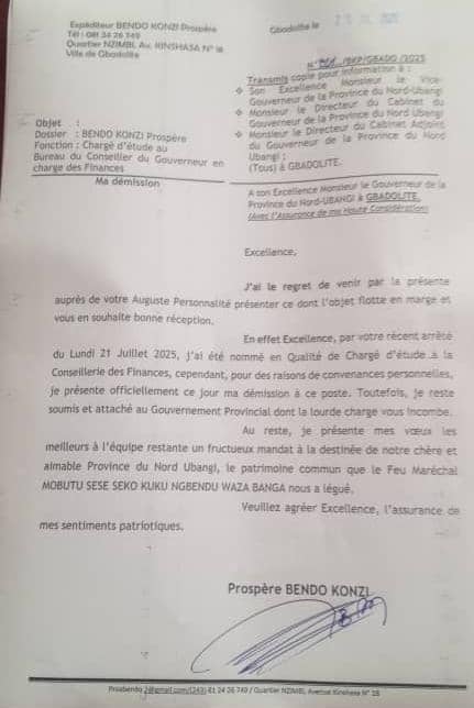 Nommé chargé d’études au bureau du conseiller du Gouverneur en charge des finances le Lundi 21 Juillet 2025, Prospère Bendo Konzi a démissionné de ses fonctions seulement 4 jours après, soit ce Vendredi 25 Juillet 2025. Les câbles de lasymbolique.net indiquent clairement que d’autres démissions en cascades sont en gestation et les prochains jours nous diront plus.