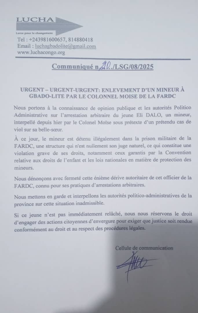 Le Mouvement Citoyen Lutte pour le Changement (LUCHA) dénonce l’enlèvement d’un mineur à Gbado-Lite au Nord-Ubangi par un officier de la FARDC nommément colonel Moïse. Nous vous convions de lire l’intégralité du communiqué d’alerte de la LUCHA dont une copie est parvenue à votre rédaction.