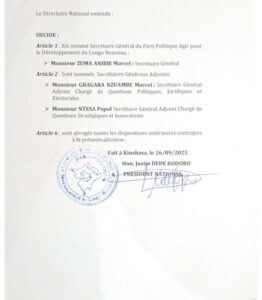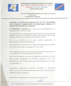 Nommé sur la décision n°008/PN-ADCN/JDK/01/025 du 27 septembre 2025, le nouveau secrétaire général de cette jeune formation politique sera secondé par deux secrétaires généraux adjoints notamment monsieur Gbagara Nzwambe Marcel, étant chargé de questions politiques, juridiques et électorales, ainsi que de monsieur Ntesa Popol, étant chargé de questions stratégiques et innovations.