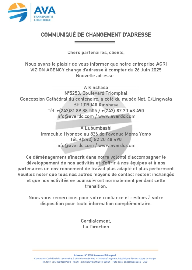 À Lubumbashi, l’AVA est désormais dès ce Jeudi 26 Juin dans l’immeuble Hypnose au 826 de l’Avenue mama Yemo. Tél : +(243) 82 20 48 490. info@avardc.com/www.avardc.net