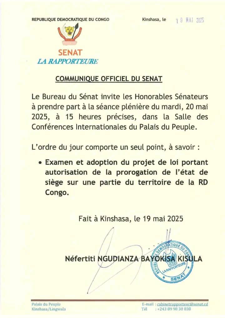 À la chambre haute parlementaire de la République Démocratique du Congo (RDC), une plénière est convoquée pour ce Mardi 20 Mai. Selon un communiqué signé par la rapporteure Néfertiti Ngudianza, un seul point figure à l’ordre du jour : l’examen et l’adoption du projet de loi portant autorisation de la prorogation de l’état de siège sur une partie du territoire national, indique ce communiqué de la chambre basse du parlement congolais.