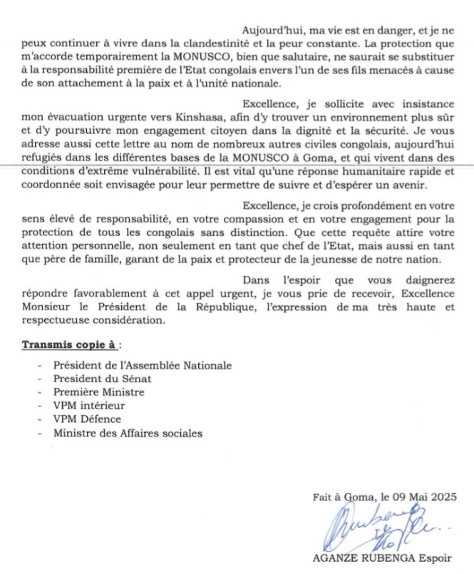 Excellence Monsieur le président, Je me permets de m’adresser humblement à votre très haute personnalité, en ma qualité de citoyen Congolais en détresse, espérant que mon cri trouvera un écho dans votre cœur de père de la Nation.Je suis AGANZE RUBENGA Espoir, Citoyen Congolais, acteur sociopolitique originaire du Kivu, cadre engagé de l’Union Sacrée de la Nation, responsable de plusieurs organisations œuvrant pour la paix, le développement et l’engagement citoyen, ancien candidat sénateur lors des dernières élections dans la province du Sud-Kivu et actuellement potentiel candidat à la présidence du Conseil National de la Jeunesse de la RDC. Depuis trois mois, je vis reclus dans une base de la MONUSCO à Goma, après avoir échappé à deux tentatives d’assassinat orchestrées par les rebelles du M-23. Ayant été approché et sensibilisé par ce mouvement armé, j’ai opposé un refus catégorique à toute forme de collaboration, m’appuyant sur mon éducation spirituelle, ma conscience citoyenne et mon attachement indéfectible aux idéaux Républicains. Ma position radicale, notamment mon appel aux jeunes à rejeter toute adhésion à cette rébellion, m’a exposé à une menace permanente.
