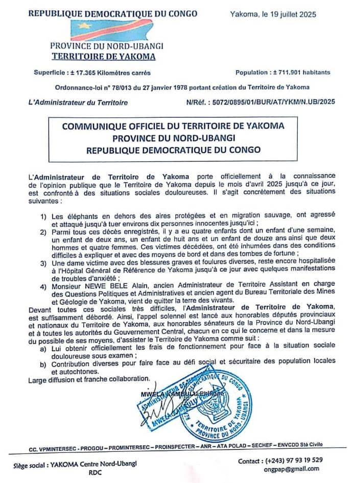 Comme atteste cette déclaration de l’autorité territoriale du 19 Juillet 2025 estampillée par le sceau original de l’administration dudit territoire, le premier citoyen de Yakoma Monsieur Philippe Mwela a tenu à peindre le tableau très sombre de la situation sociale cruciale qui sévisse dans cette partie du pays depuis le mois d’avril dernier, causant ainsi 10 morts à ce jour.