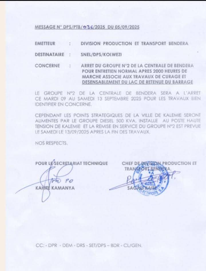 « Nous avons l’honneur de porter à votre connaissance que, le groupe n°2 de la Centrale de Bendera sera à l’arrêt ce Mardi 09 au Samedi 13 septembre 2025 pour les travaux bien identifiés en concerne », peut-on lire dans la présente lettre adressée au Gouverneur de Province.Ces travaux annoncés du Mardi 09 au Samedi 13 septembre 2025 replongera alors là ville dans le noir durant cette période. Néanmoins, quelques points stratégiques de la ville de Kalemie seront alimentés par le groupe Diesel 500 KVA installé au poste haute tension de Lukuga. Cependant, la remise en service d’exploitation de la Centrale interviendra à la fin des travaux, précise ledit communiqué.