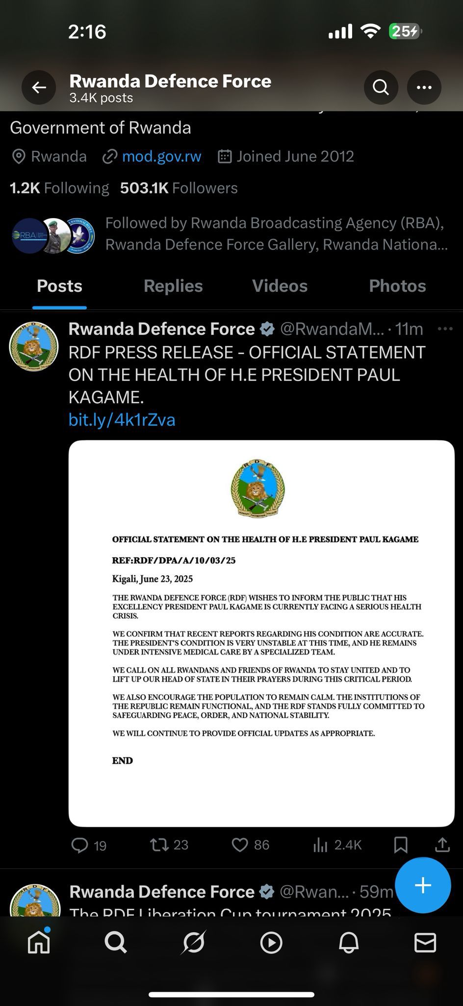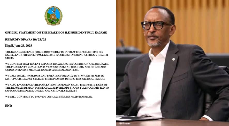 l’Armée Rwandaise a annoncé ce lundi 23 juin 2025 au peuple Rwandais que le Président Paul Kagame est malade et que son état de santé actuel est très critique. Pour ce faire, il a été demandé au peuple Rwandais de prier pour le Président.Ce communiqué a été publié sur le compte X de l’Armée Rwandaise avant d’être retiré quelques heures plus tard.Que comprendre de cela ? Est-ce que c’est de la vraie maladie ou simplement une stratégie Rwandaise de duper l’opinion afin de ne pas se présenter aux États-Unis pour l’accord de paix avec la République Démocratique du Congo dont-il subit des pressions diplomatiques de la part des États-Unis ? Les heures suivantes nous dirons plus sur cette attitude et communiqué publié et retiré quelques temps après par l’Armée Rwandaise.